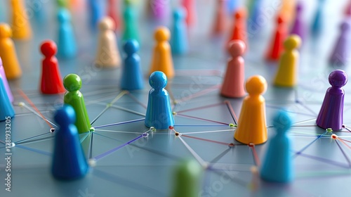Networking and communication concept with multicolored toy figures joined by intersecting lines.