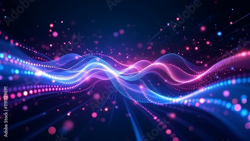 Neural network 3D illustration. Big data and cybersecurity. Data stream. Global database and artificial intelligence. Bright, colorful background with bokeh effect