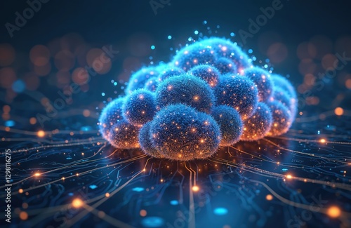 Neural network manages cloud computing. AI visualization like brain connecting data. Concept of future tech, digital transformation, machine learning and big data processing. Global cyberspace.