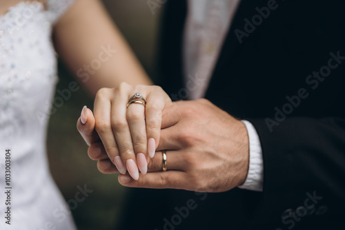 Newly wed couple's hands with wedding rings.