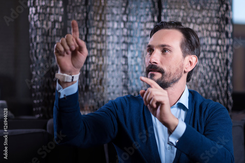 Nice bearded man touching the virtual screen
