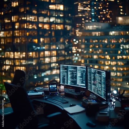 Night cityscape view from office, programmer's desk with multiple monitors displaying code, keyboard, and documents.