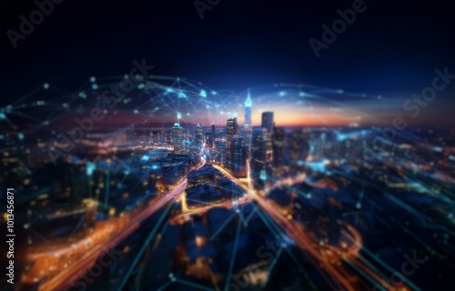 Night cityscape with glowing lights and a digital network overlay.