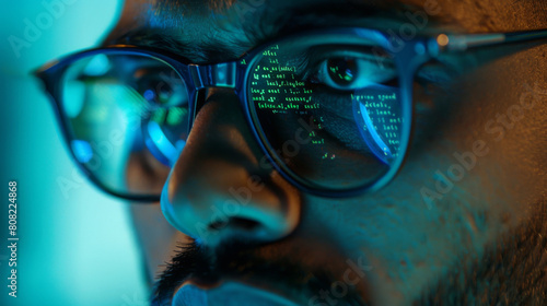 Night, man and glasses with reflection of software development, coding and information technology for fintech. Programmer, screen and IT problem solving, data analysis and cyber security research
