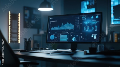 Night office desk with computer displaying data analytics charts.