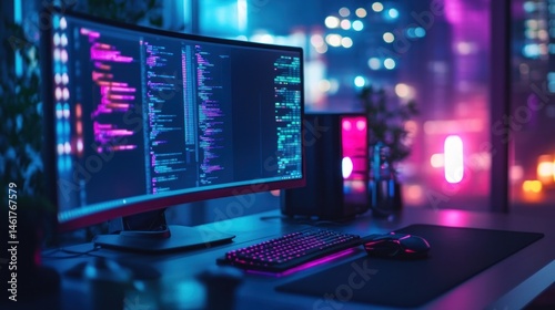Night programmer's desktop setup with a large monitor displaying lines of code, keyboard, and mouse.