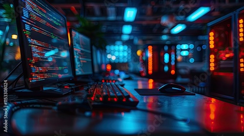 Night Scene of a Coding Workspace with Computer Monitors Displaying Code, Keyboard, and Mouse