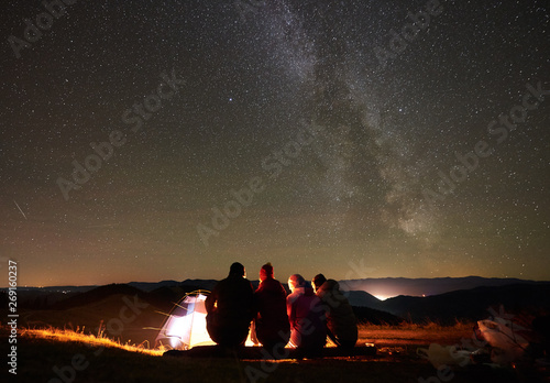 Night summer camping in mountains. Back view group of four hikers sitting on a bench made of logs together around bonfire near glowing tourist tent under night starry sky full of stars and Milky way.