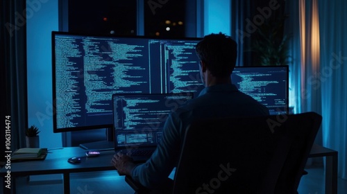 Nighttime Coding Session: A Programmer Fully Immersed in a Minimalist Studio Environment