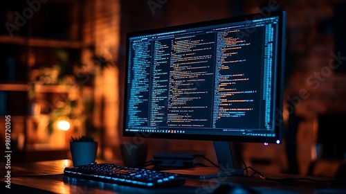 Nighttime coding session, the computer screen filled with complex lines of code, dim lighting in the office, the only source of light coming from the glowing monitors, creating a quiet,