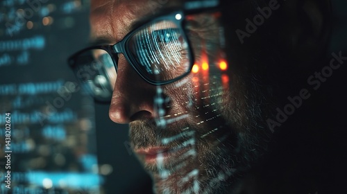 Nighttime Developer Deep in Coding with Data Stream Overlay