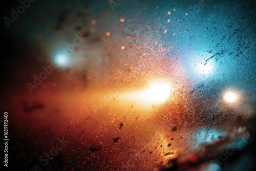 Nighttime rain-streaked window view