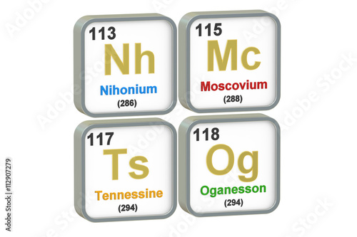 Nihonium, Moscovium, Tennessine, Oganesson chemical elements, 3D