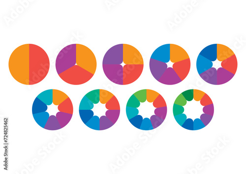 nine step pie slices. round pie charts. 2 steps-10 steps pie slices