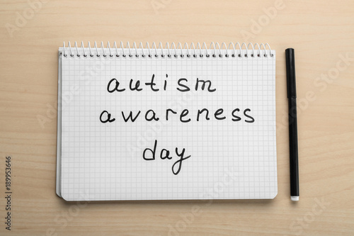 Notebook with phrase "Autism awareness day" on light background