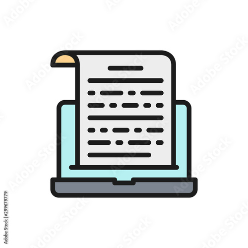 Notes on a laptop, presentation, text entries flat color icon.