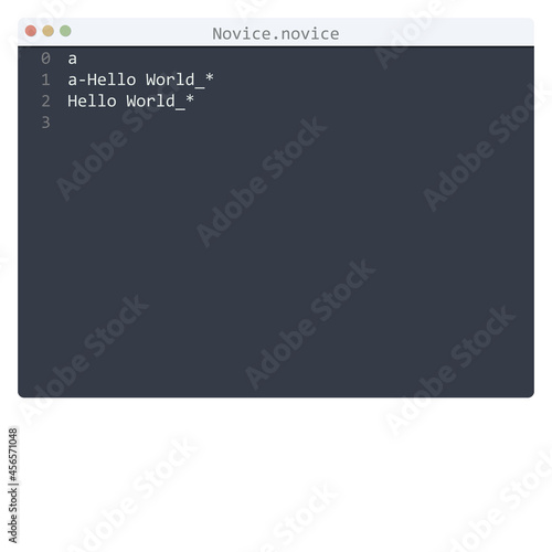 Novice language Hello World program sample in editor window