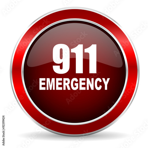 number emergency 911 red circle glossy web icon, round button with metallic border