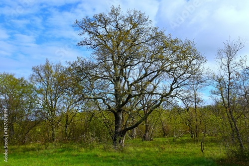 Oak (Quercus) tree on a green meadow in springtime