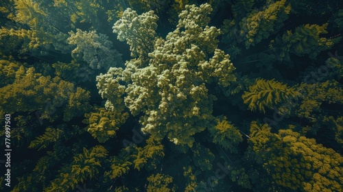 Oak tree forest, view from the top, fresh weather. Generative AI.