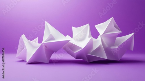 Observe white abstract shapes on purple background. geometric forms create intriguing design. 3D render.