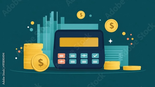 of a smart savings account system with a calculator and various financial elements like coins dollar bills and data charts The design showcases a modern flat style for banking investment