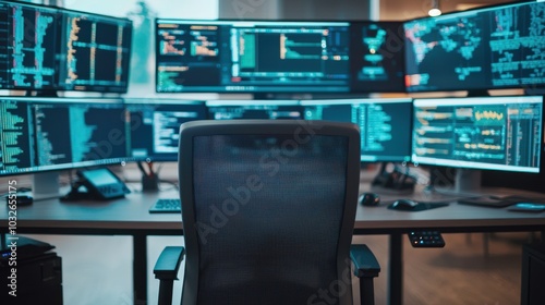 Office Chair Back View with Multiple Monitors Showing Code and Data