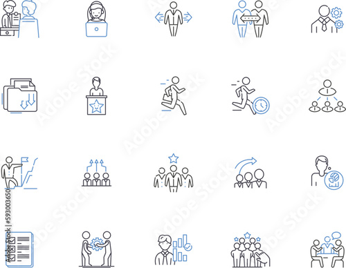 Office outline icons collection. Workplace, Desk, Chair, Computers, Stationery, Printer, Filing vector and illustration concept set. Management, Supplies, Clerical linear signs