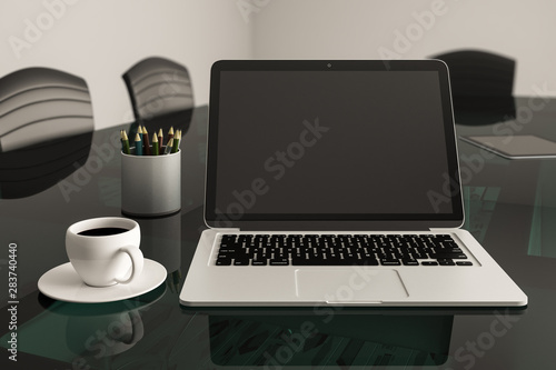 Office situation concept with black mock up laptop monitor on glass table with coffee mug.