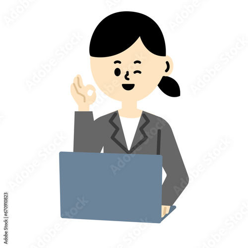 ビジネス コンピュータ ノートパソコン 女性 スーツ OK 了解 ウインク 仕事 イラスト