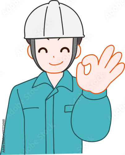 ヘルメットを被り、作業服を着たOKする笑顔のデフォルメ男性のイラスト