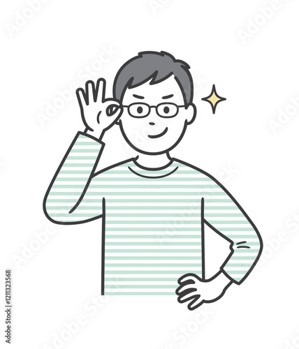 OKポーズをする高齢者男女斜め眼鏡を上げてニヤリと笑い自信を見せる若い男性
