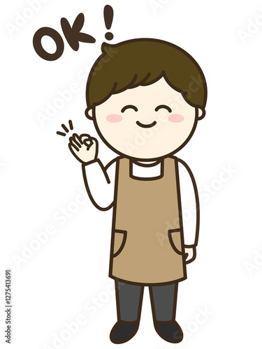 エプロンを着た男性がOKポーズをしているシンプルなイラスト ブラウン系
