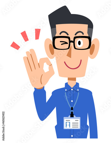 社員証を付け、手でOKマークを作るメガネをかけて青いシャツを着た男性