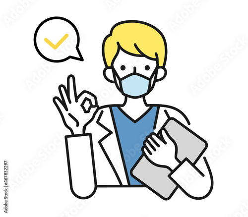 OKサインをする白衣を着てマスクをした男性の看護師/医師のイラスト素材