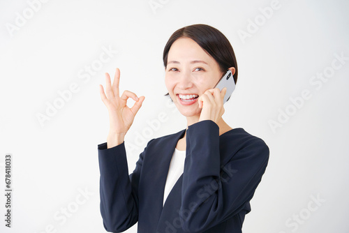 スマートフォンで電話をしながらOKサインをする中年のビジネスウーマン 白背景