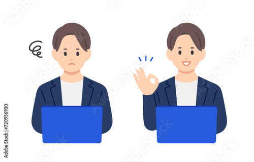 パソコンを見て悩む・OKポーズをするビジネスパーソン男性のセット【人物ベクターイラスト素材】