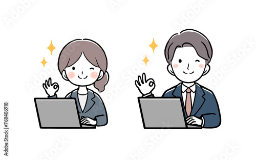 OKサインをしてパソコンを使うビジネスウーマンとビジネスマン