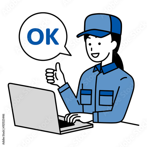 OKサインをするノートパソコンで仕事をしているつなぎ作業服の女性