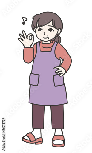 腰に手を当ててOKサインをしているエプロン姿の女性C【カラー/全身】