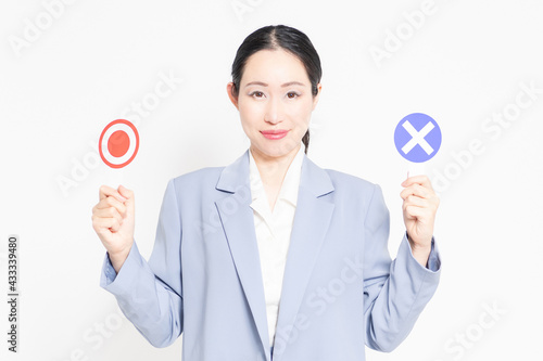 白バックの前に立って、OKとNGのプラカードを持っている女性
