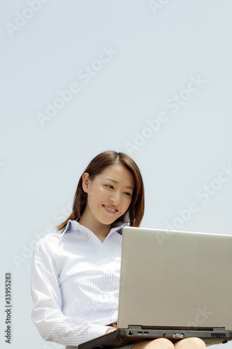 外でノートパソコンを使うOL