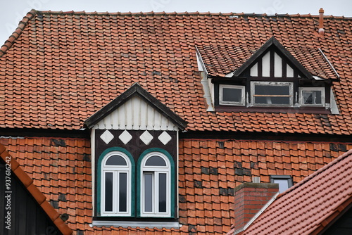Old half-timbered house with red tiles or shingles and windows with wooden elements