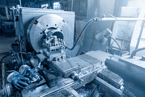 old metalworking machine. Vintage lathe in the production hall in blue tones