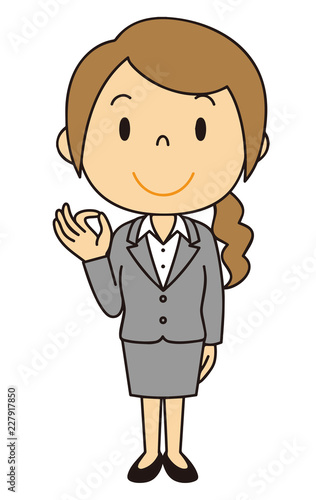 女性 OL 事務員 OKポーズ 立ち姿 グレーのスーツ