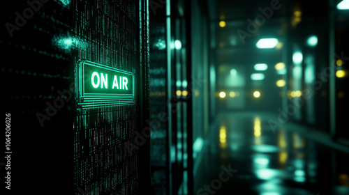 On a dark wall, a neon "ON AIR" sign glows brightly in a dimly lit hallway. Concept of broadcasting, technology, and communication.