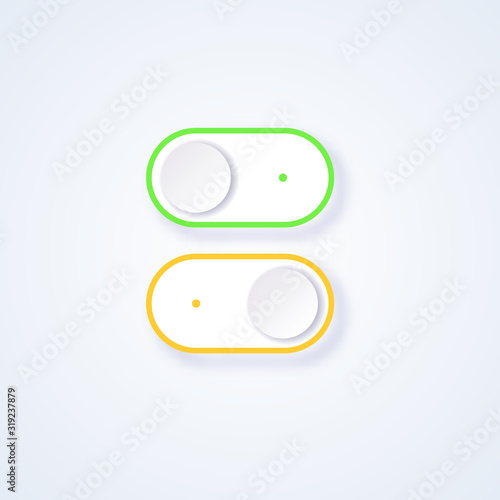 On and Off slider button. Switch interface button. Vector 3d illustration. Flat icon On and Off toggle switch button. Switch toggle button, slider in ON and OFF position