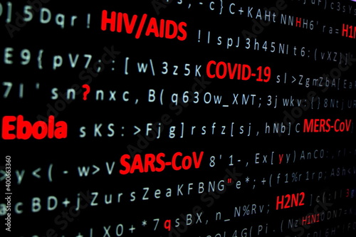on screen of pc monitor string of words aids, sars, mers, ebola, covid denoting types epidemiological and viral threats highlighting in red font among chaotic set of computer green symbols. Side view