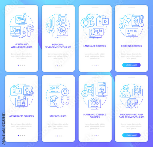 Online education fields blue gradient onboarding mobile app screen set. Walkthrough 4 steps graphic instructions with linear concepts. UI, UX, GUI template. Myriad Pro-Bold, Regular fonts used