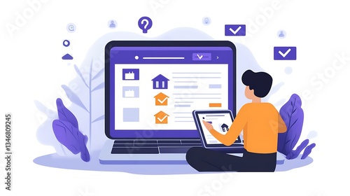 Online Real Estate Management Illustration, Illustration of a person using a laptop for online real estate management